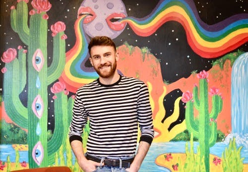 Ben Rodrigo loves loud, bright colors. If there was any doubt, just check out his artwork. Perhaps his coolest piece is painted on an 8-foot by 8-foot wall inside the Saxbys cafe at Temple University on Liacouras Walk — the culmination of 45 hours of hard work. It looks like an album cover for a band you didn’t realize you love.