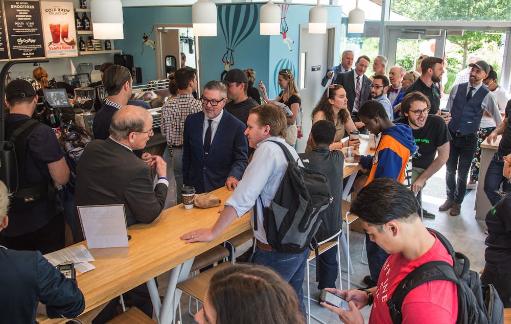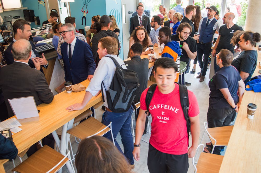 Drexel President John Fry attended our grand opening and pulled the inaugural espresso shot with our CEO, Nick Bayer.